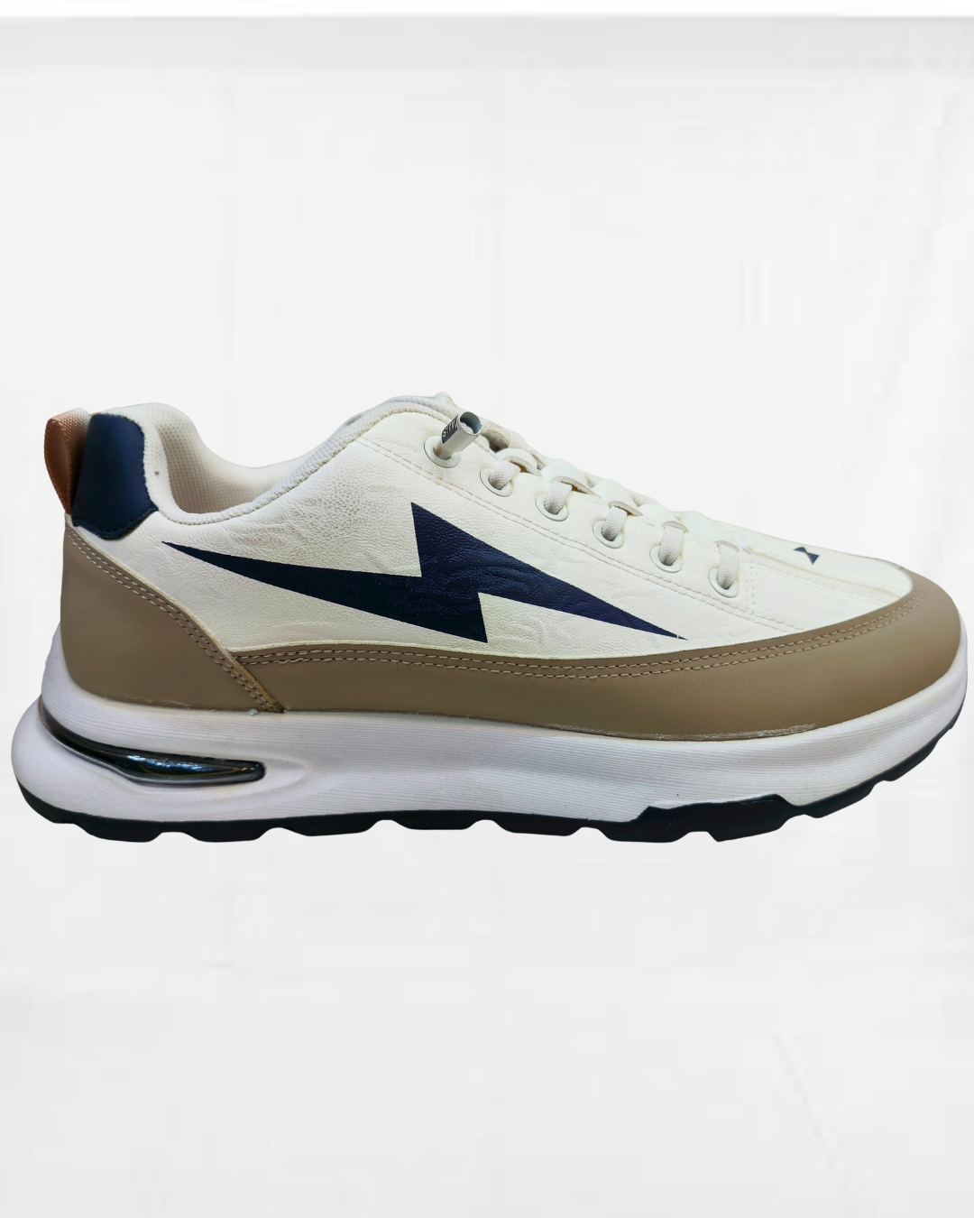 Elevate your everyday street style with the SAVY Bolt-Series Sneakers. Designed for the modern Pakistani man who values both flair and functionality, these sneakers feature a striking navy lightning bolt motif set against a clean, off-white upper. The sophisticated color palette of cream, tan, and navy makes them incredibly versatile for pairing with dark denim, chinos, or traditional casual wear.